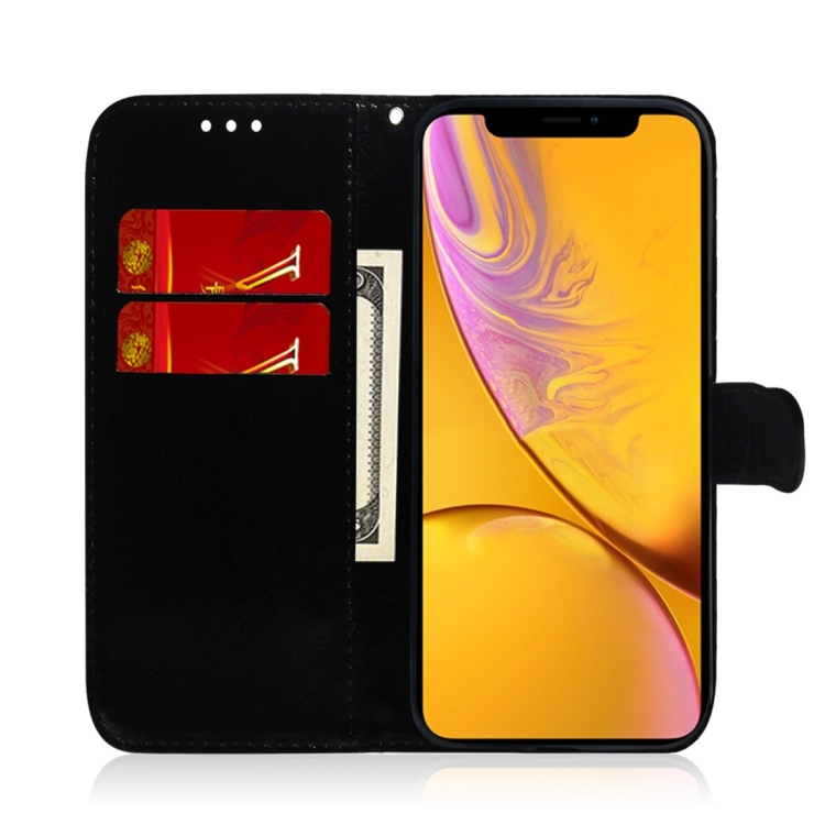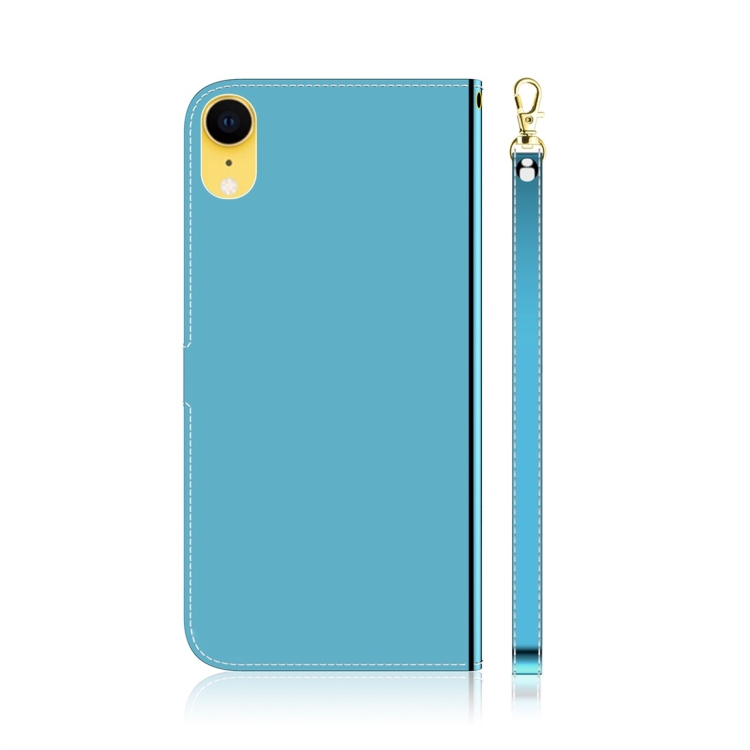 Estuche de Cuero para iPhone Xr con Superficie de Espejo Imitada, Tapa Horizontal, Soporte, Ranuras para Tarjetas, Billetera y Cordón (Azul)