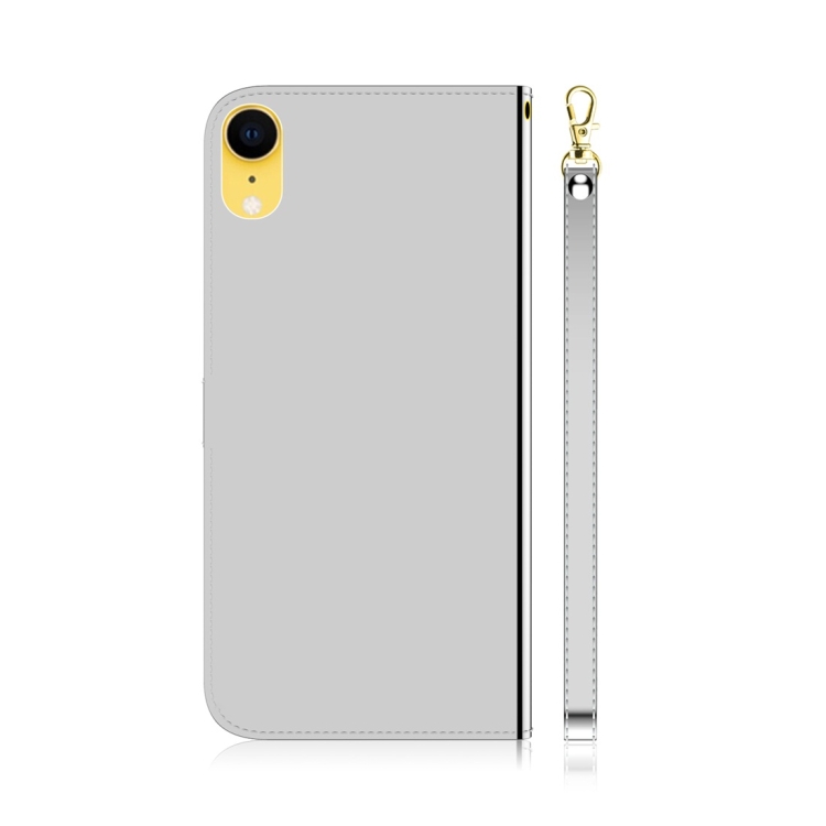 Estuche de Cuero para iPhone Xr con Superficie Espejo Imitada Tapa Horizontal Soporte Ranuras para Tarjetas Billetera y Cordón (Plata)