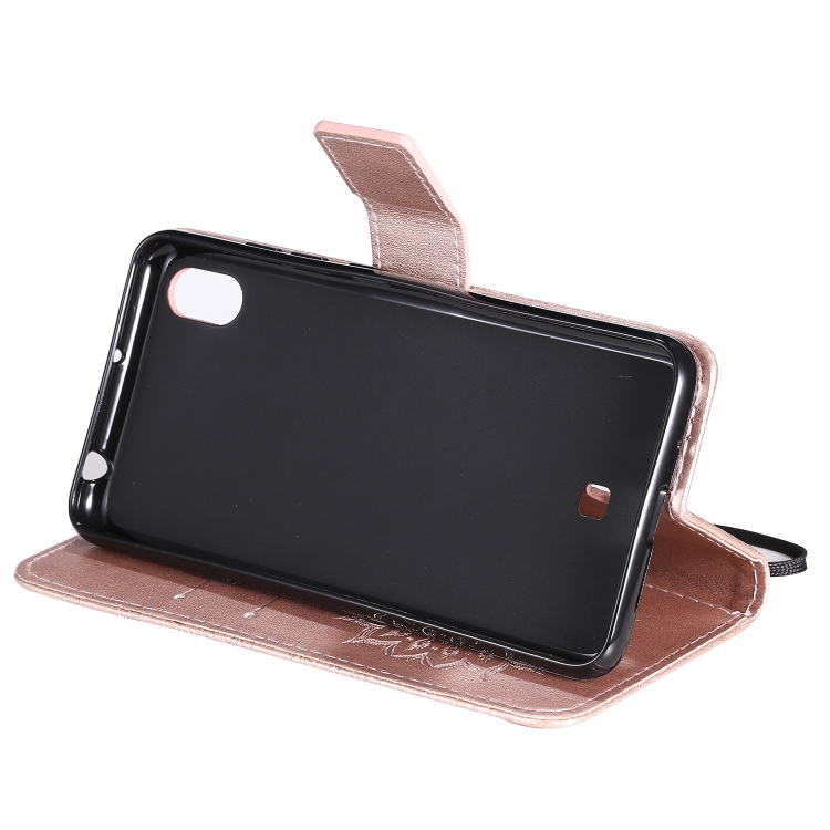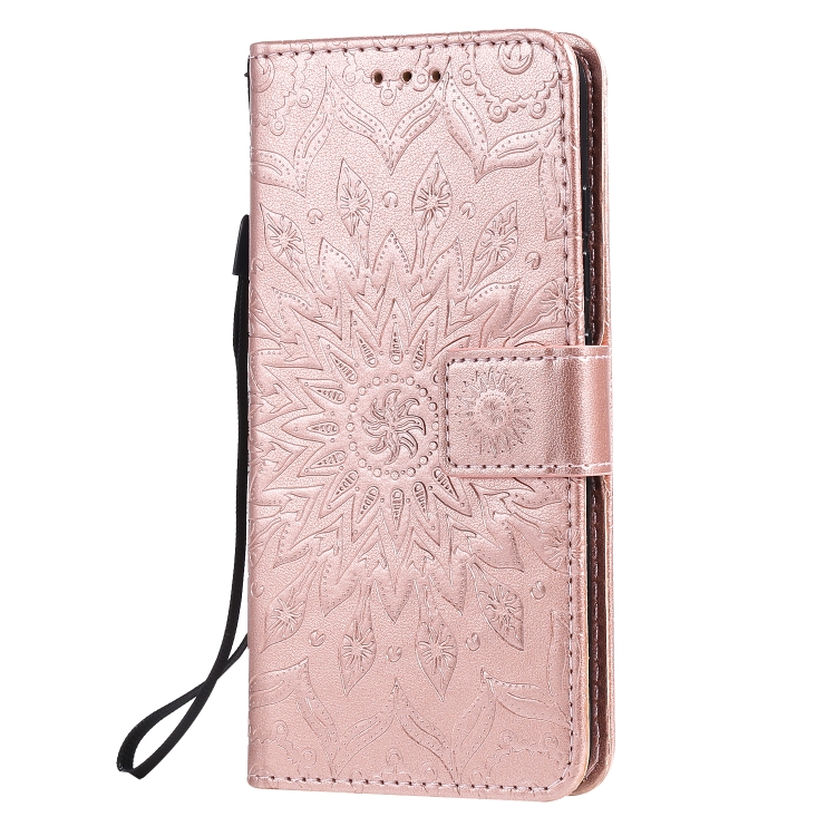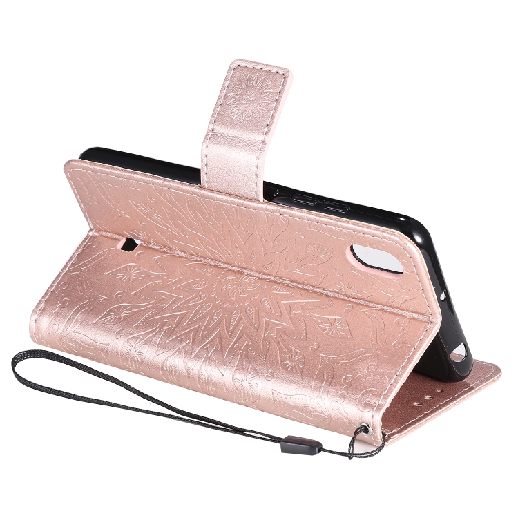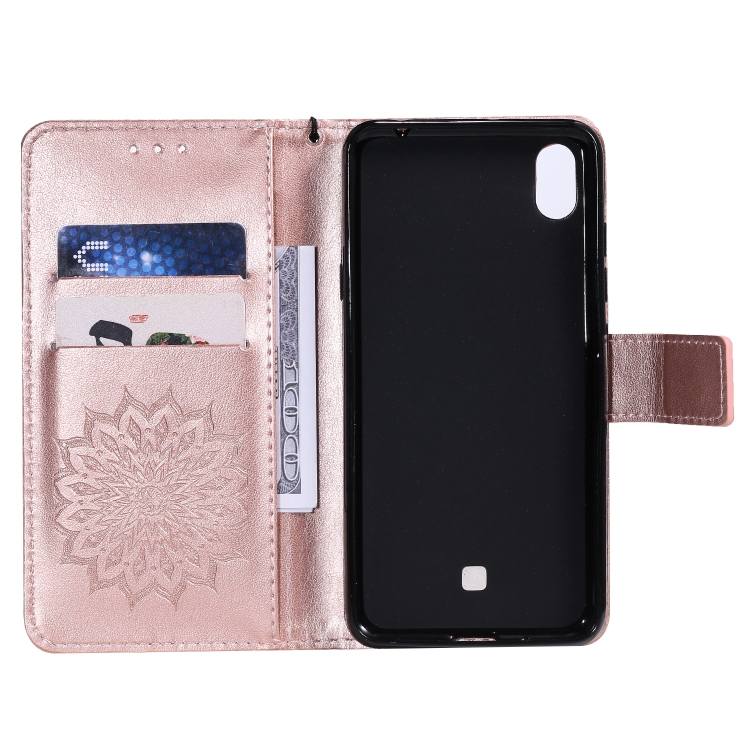Funda Cuero Pu para LG K20 (2019) con Tapa Horizontal, Estampado Girasol, Soporte, Ranuras y Cordón (Oro Rosa)