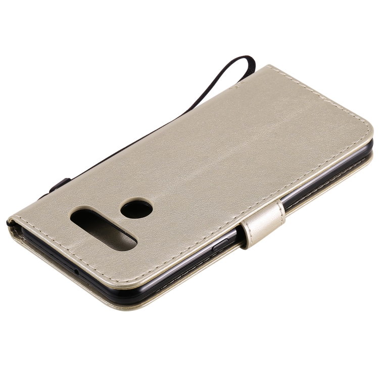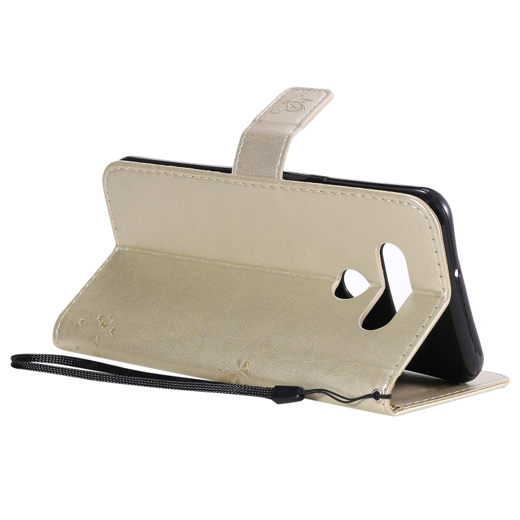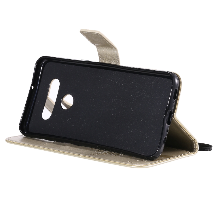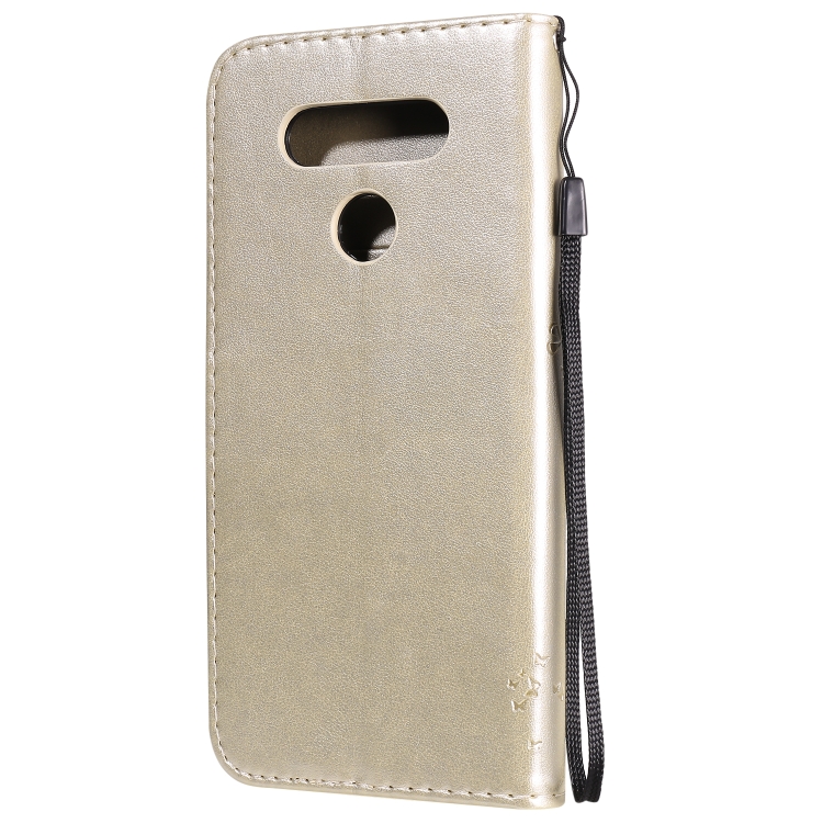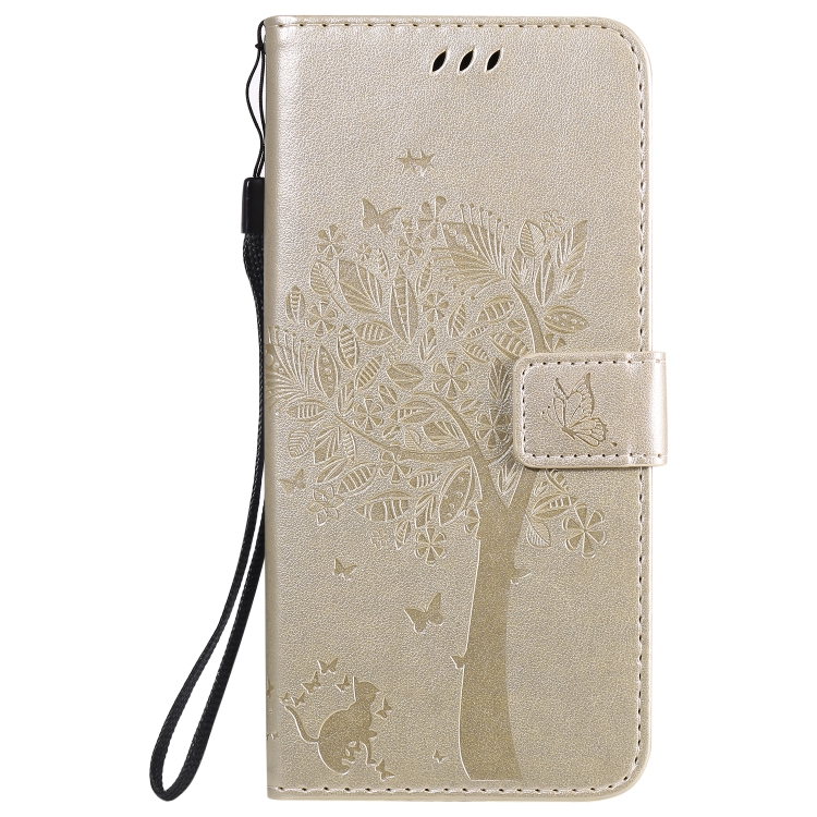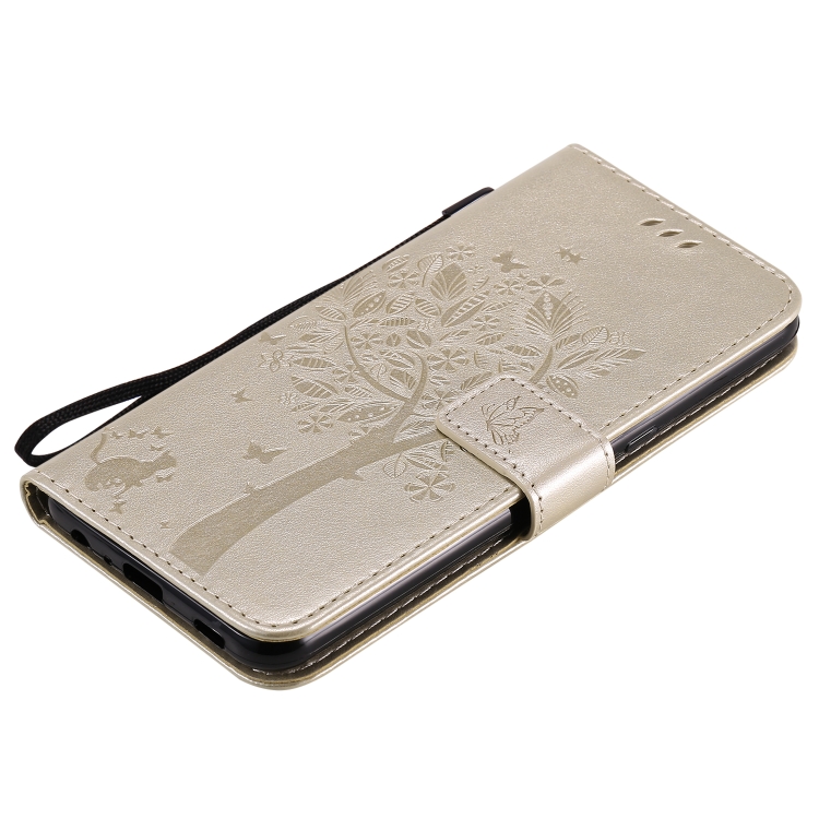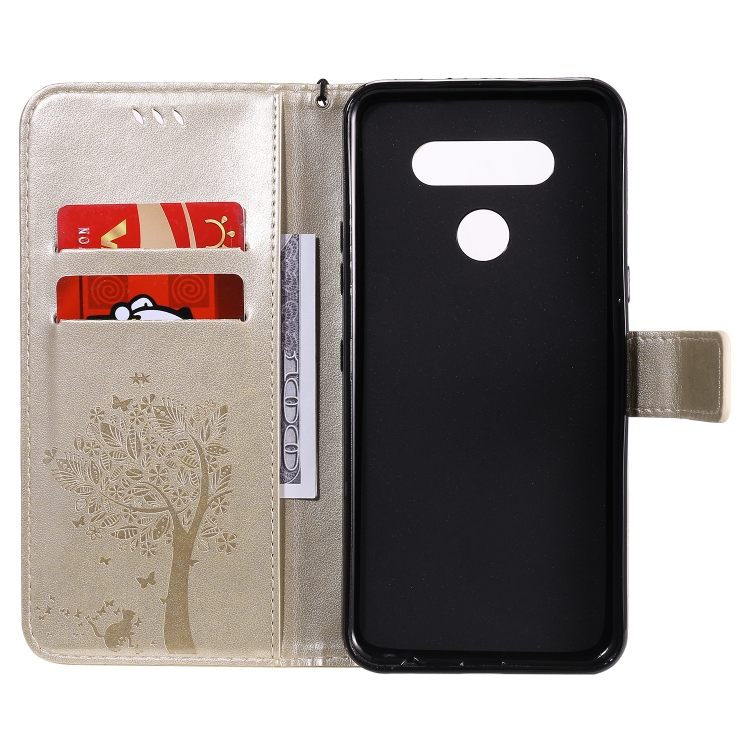 Funda de Cuero para LG K51 Tree & CAT con Tapa Horizontal, Soporte, Ranuras para Tarjetas y Cordón (Dorado)