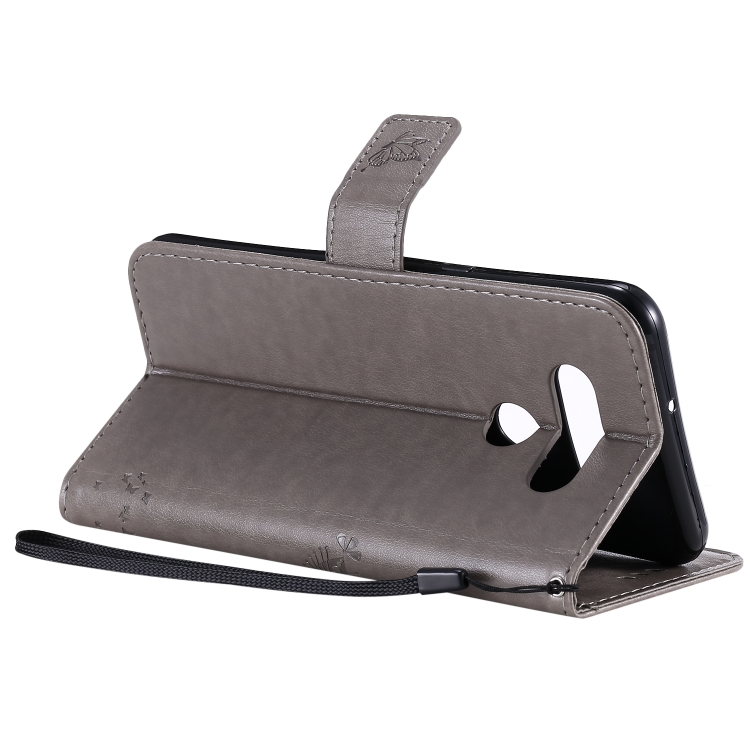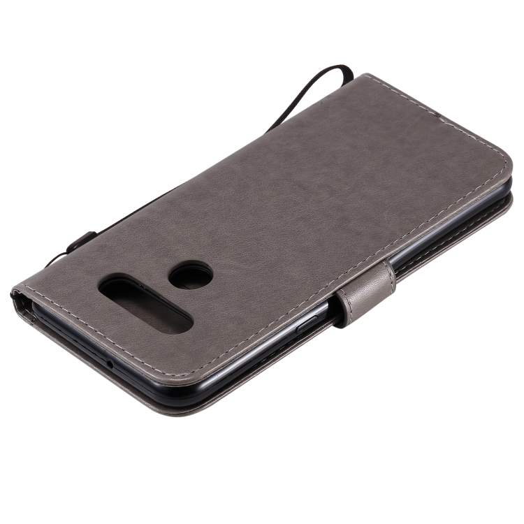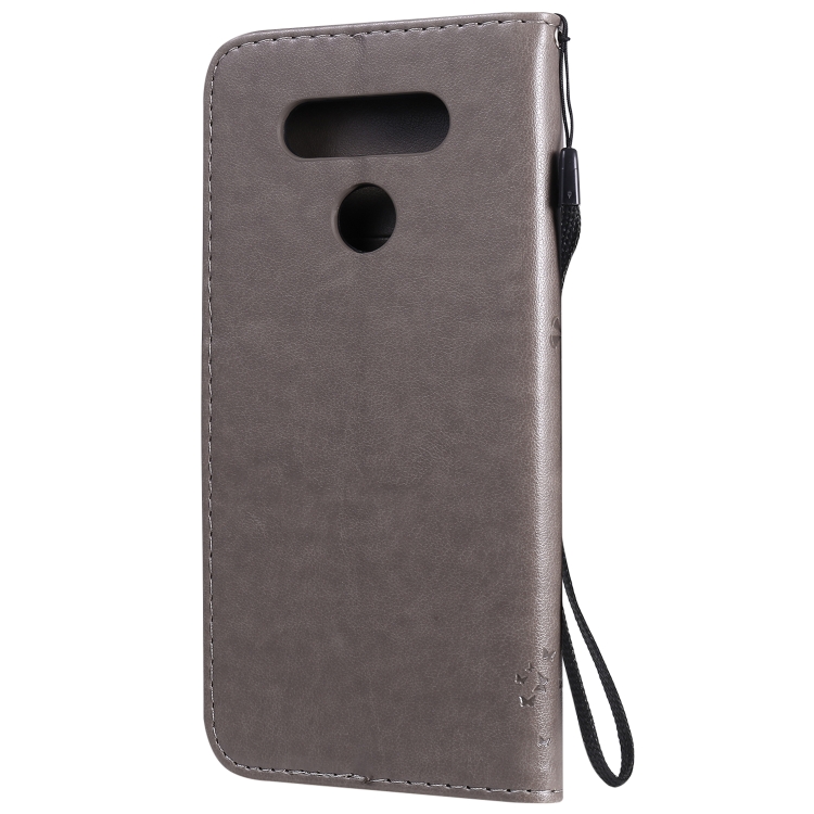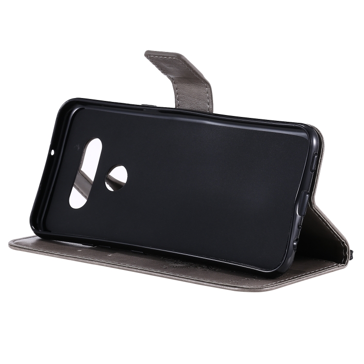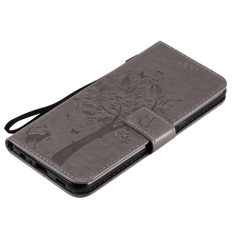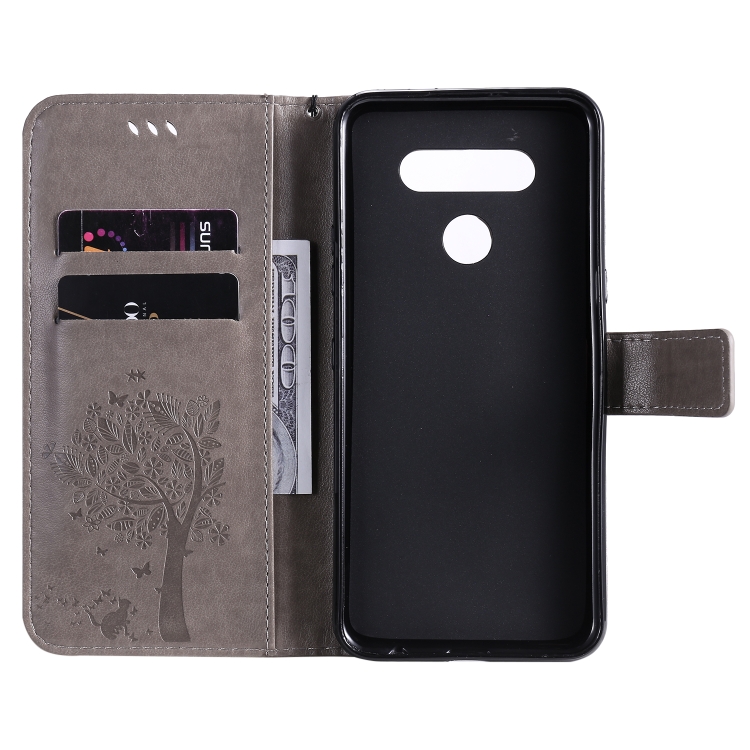 Funda de Cuero para LG K51 Tree & CAT con Tapa Horizontal, Soporte, Ranuras para Tarjetas, Billetera y Cordón (Gris)