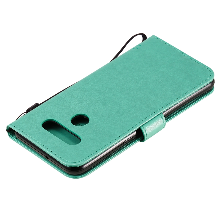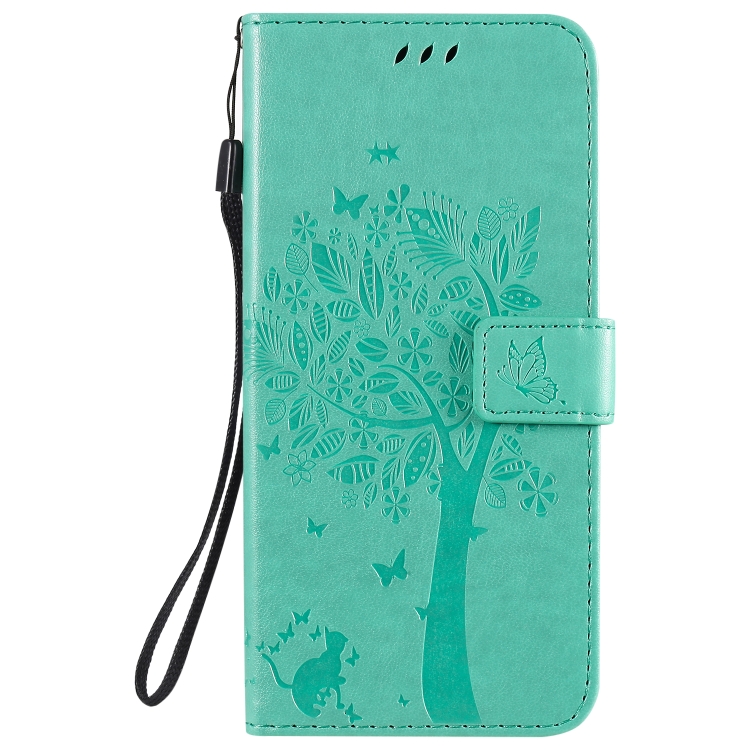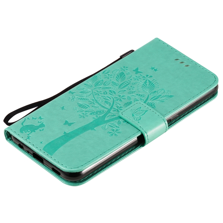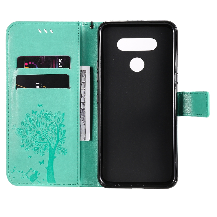 Funda de Cuero para LG K51 Tree & CAT con Tapa Horizontal, Soporte, Ranuras para Tarjetas, Billetera y Cordón (Verde)