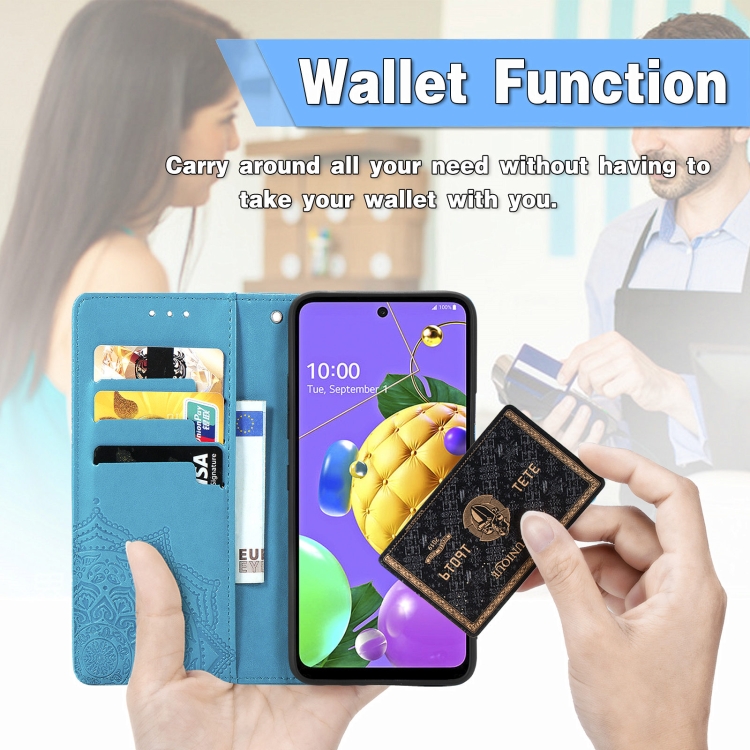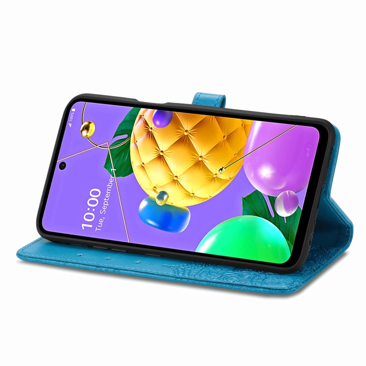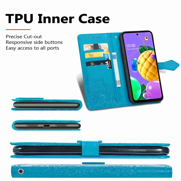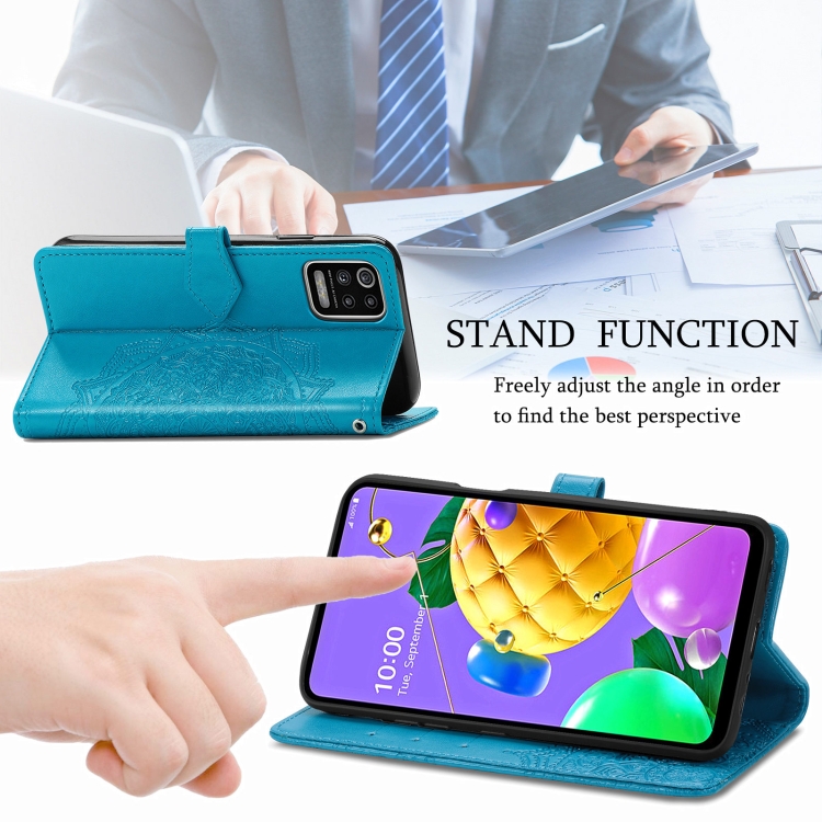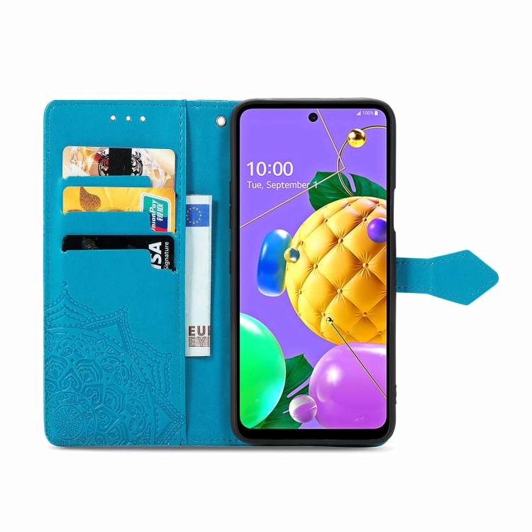 Funda de Cuero para LG K52 Mandala Flower con Tapa Horizontal, Soporte, Ranuras para Tarjetas y Cordón (Azul)