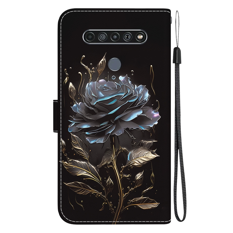 Estuche de Cuero para LG K61 con Dibujo Coloreado y Textura de Cristal (Rosa Negra)