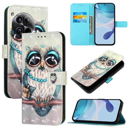 Funda de Cuero para OnePlus 12 Global 3D Painting con Tapa Horizontal (Búho Gris)