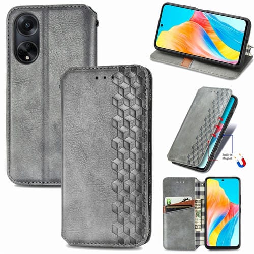 Para Oppo A98 Cubic Grid Funda de Teléfono de Cuero Magnético Prensado (Gris)