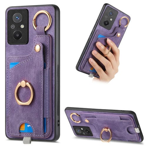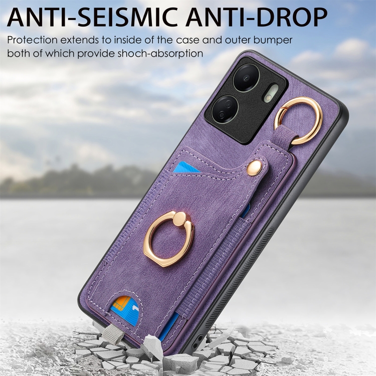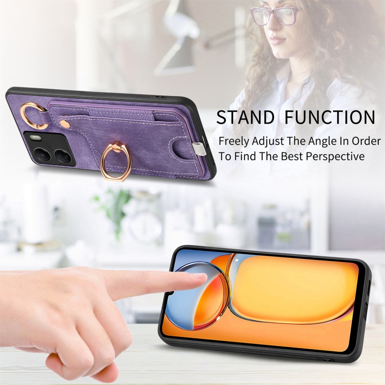 Para Redmi 12C Funda para Teléfono con Bolsa para Tarjeta con Anillo y Sensación de Piel Retro con Lazo para Colgar (Púrpura)
