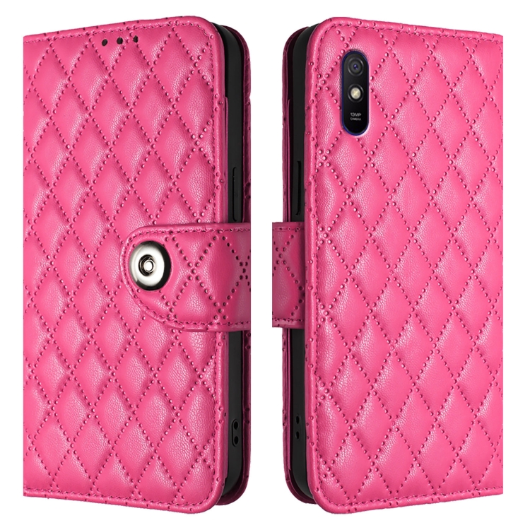Para Redmi 9A / 9I / 9At Funda para Teléfono con Tapa de Cuero con Textura Rómbica y Cordón (Rojo Rosa)