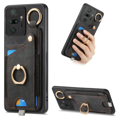 Para Redmi Note 10 Pro 5G Funda para Teléfono con Bolsa para Tarjeta con Anillo y Sensación de Piel Retro con Lazo para Colgar (Negro)
