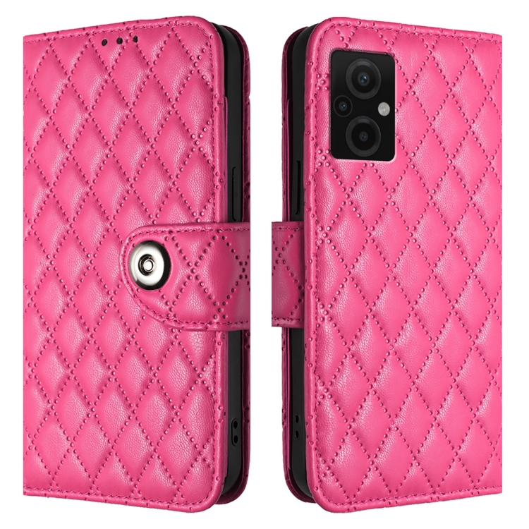 Para Redmi Note 11R / Note 11E Funda para Teléfono de Cuero con Tapa con Textura Rómbica y Cordón (Rojo Rosa)