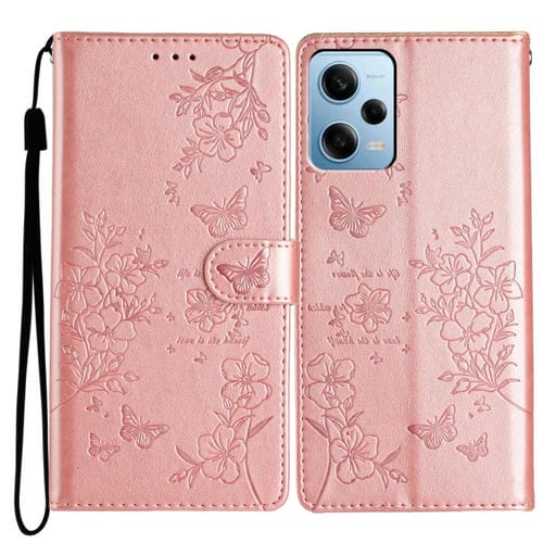 Para Redmi Note 12 Pro 5G Funda de Cuero para Teléfono con Mariposas y Flores Globales (Oro Rosa)