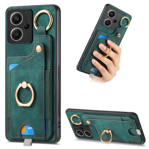 Para Redmi Note 13 Pro + 5G Funda para Teléfono con Bolsa para Tarjeta con Anillo y Sensación de Piel Retro con Lazo para Colgar (Verde)
