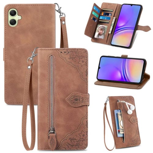 Funda de Cuero para Samsung Galaxy A05 con Cremallera y Flores en Relieve (Marrón)