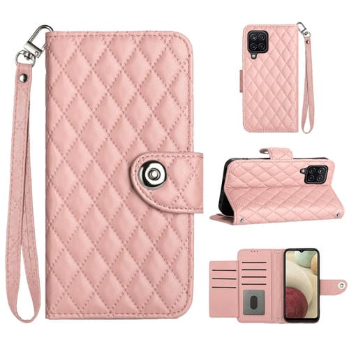 Funda para Teléfono Samsung Galaxy A12 / M12 Tapa de Cuero Textura Rómbica Cordón (Rosa Coral)