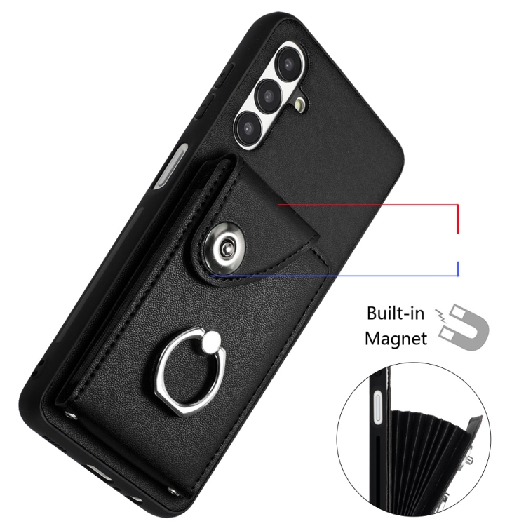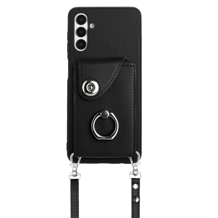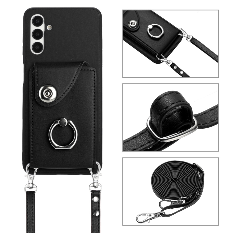 Funda para teléfono Samsung Galaxy A13 5G / A04S con soporte para anillo y bolsa para tarjeta con cordón largo (Negro)