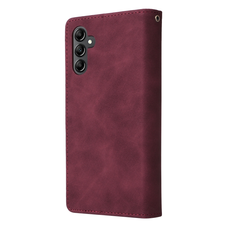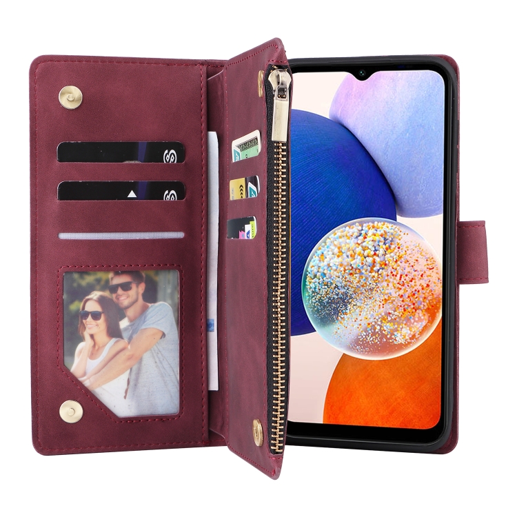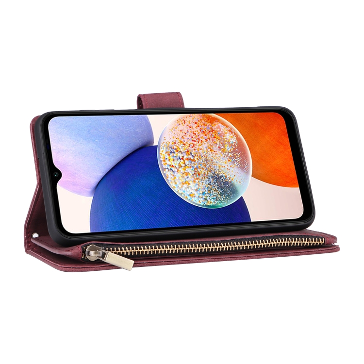 Funda para Samsung Galaxy A15 5G Cuero con Billetera y Cremallera Multifuncional (Rojo Vino)