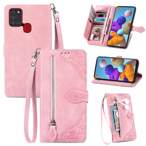 Funda de Cuero Samsung Galaxy A24S con Cremallera y Flores en Relieve (Rosa)