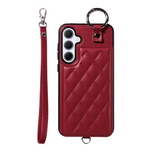 Estuche para Teléfono Samsung Galaxy A35 5G con Bolsa para Tarjetas Textura Rómbica y Cordón Corto (Rojo Vino)