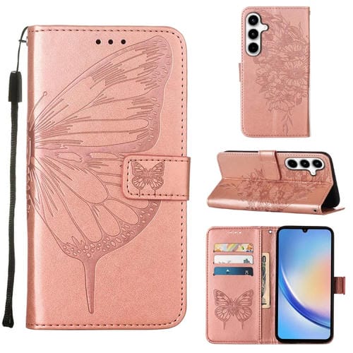 Funda de Cuero Samsung Galaxy A35 5G con Mariposa en Relieve (Oro Rosa)