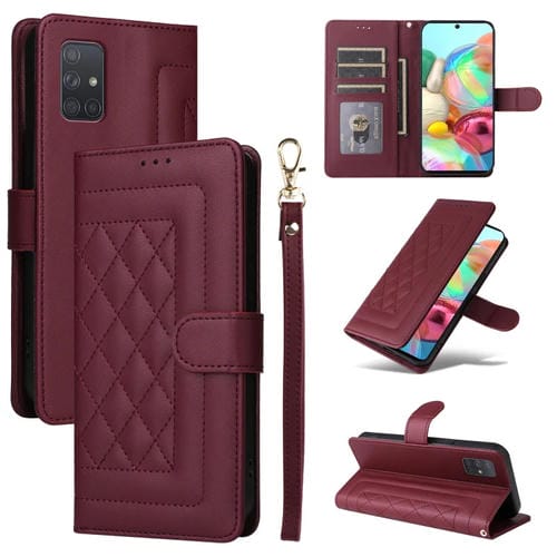 Estuche para Teléfono Samsung Galaxy A71 con Tapa de Cuero Diamond Lattice (Rojo Vino)