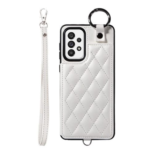 Estuche para Teléfono Samsung Galaxy A73 5G con Bolsa para Tarjetas Textura Rómbica y Cordón Corto (Blanco)