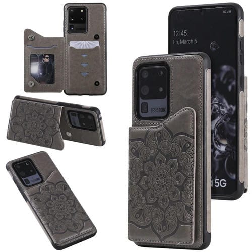 Estuche protector para Samsung Galaxy S20 estampado de flores con soporte, ranuras para tarjetas y marco de fotos (Gris)