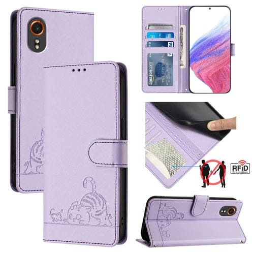 Estuche para Teléfono Samsung Galaxy Xcover 7 con Patrón en Relieve Rfid PU y Correa para Muñeca (Púrpura)