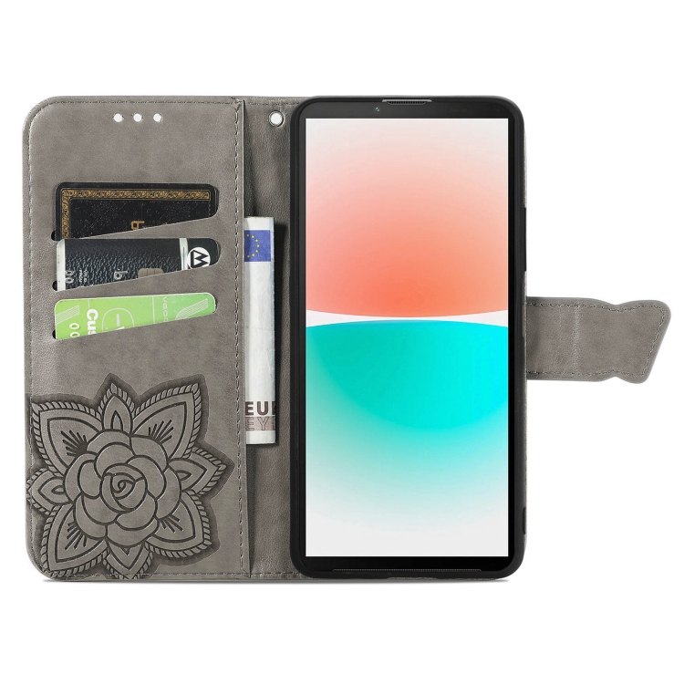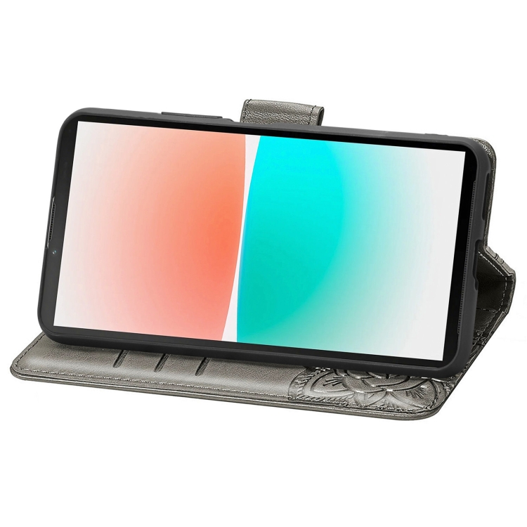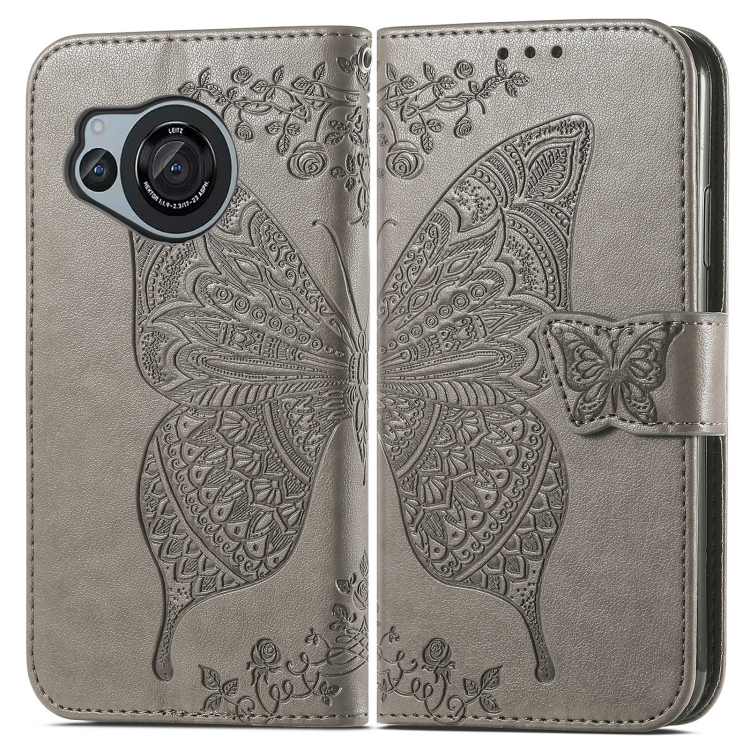 Estuche para Sharp Aquos R8 Butterfly Love Flower Cuero En Relieve (Gris)