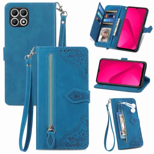 Funda de Cuero para T-Mobile Revvl 7 5G con Cremallera y Flor en Relieve (Azul)