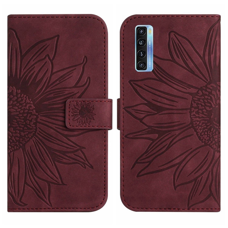 Funda Flip de Cuero TCL 20 Pro 5G Skin Feel con Cordón y Patrón Sun Flower (Rojo Vino)