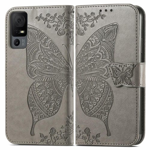 Funda de Cuero para TCL 40 XL Butterfly Love Flower con Relieve (Gris)