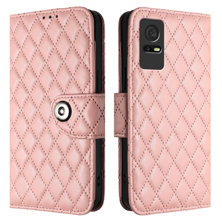 Funda para Teléfono TCL 405/406/408 Cuero con Tapa Textura Rómbica y Cordón (Rosa Coral)