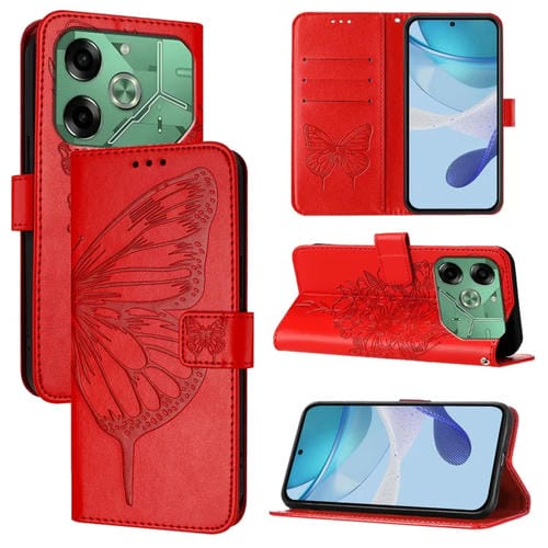 Funda de Cuero para Tecno Pova 6 con Mariposa en Relieve (Rojo)