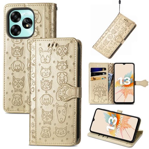 Funda para Umidigi A15C de Cuero con Relieve de Perros y Gatos (Dorado)