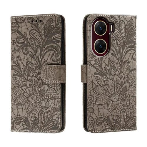 Para Vivo V29E Funda para Teléfono de Cuero con Tapa y Estampado de Flores de Encaje (Gris)