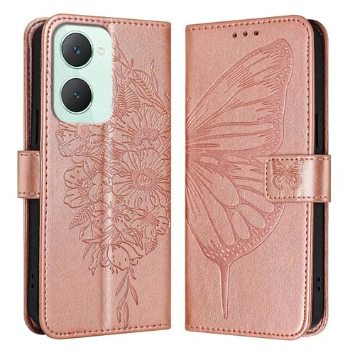 Para Vivo Y03 4G Funda para Teléfono de Cuero con Mariposa En Relieve Global (Oro Rosa)