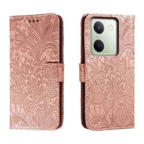 Para Vivo Y100 5G Funda para Teléfono de Cuero con Tapa y Estampado de Flores de Encaje (Oro Rosa)