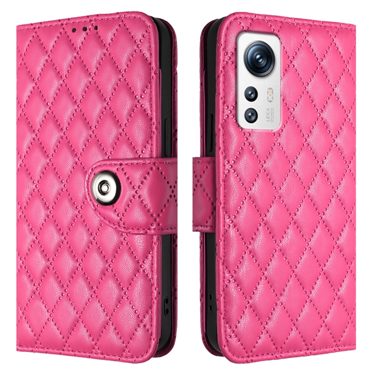 Para Xiaomi 12/12X / 12S Funda para Teléfono de Cuero con Tapa con Textura Rómbica y Cordón (Rojo Rosa)
