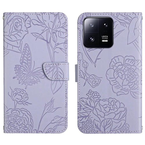 Para Xiaomi 13 Ht03 Skin Feel Butterfly Funda de Cuero con Tapa En Relieve para Teléfono (Púrpura)