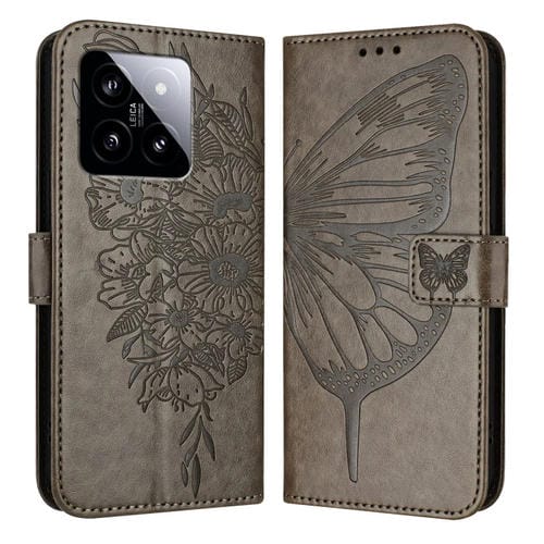 Para Xiaomi 14 5G Funda De Teléfono De Cuero Con Mariposa En Relieve Global (Gris)