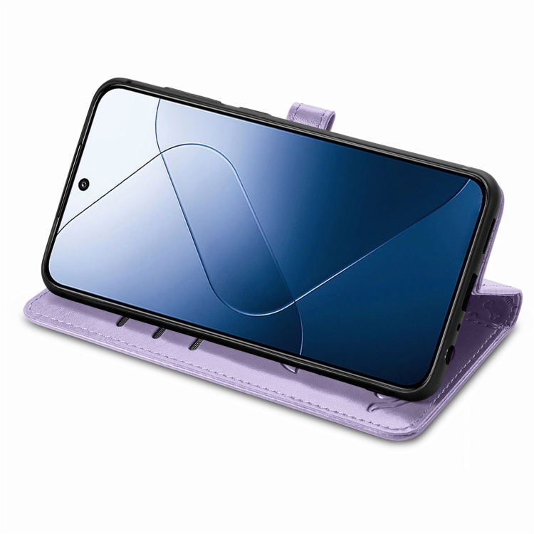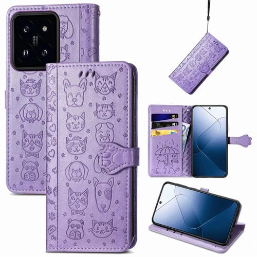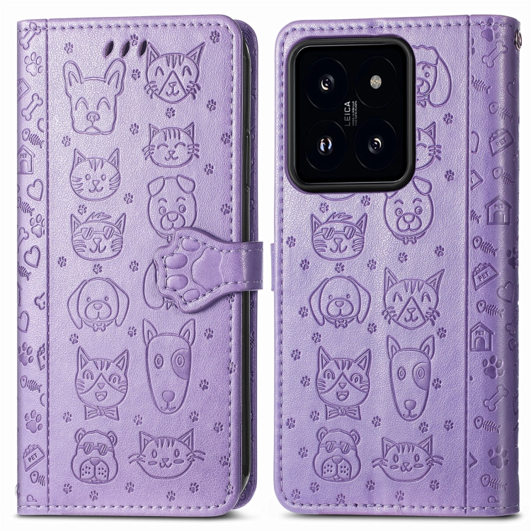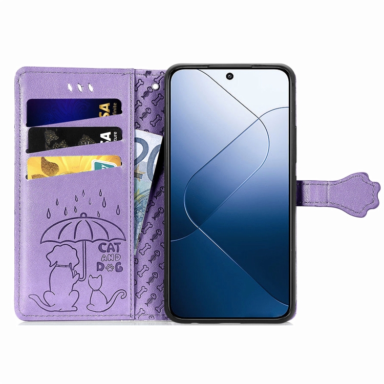 Para Xiaomi 14 Pro Funda De Teléfono De Cuero Con Relieve De Perro Y Gato (Púrpura)