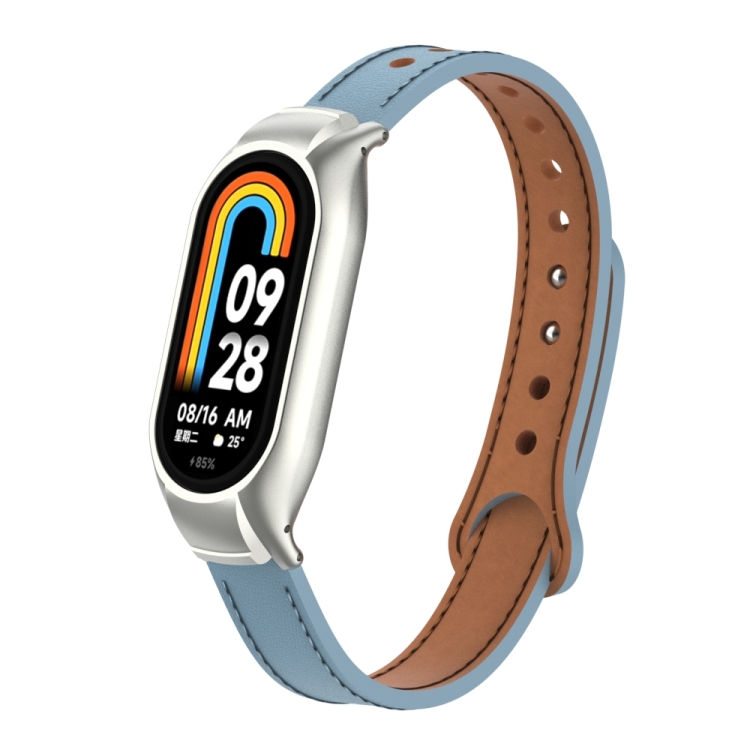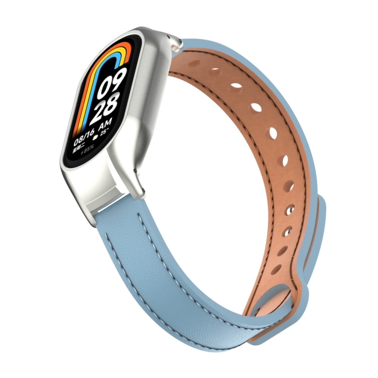 Caja de Metal Integrada + Banda de Cuero Microfibra Doble Clavo para Xiaomi Mi Band 8 (Azul Claro)