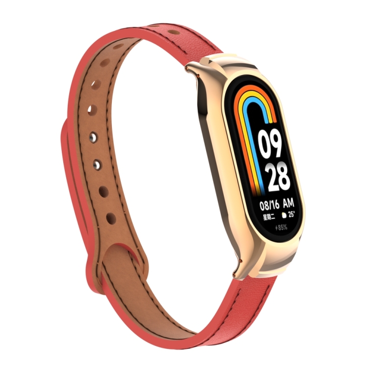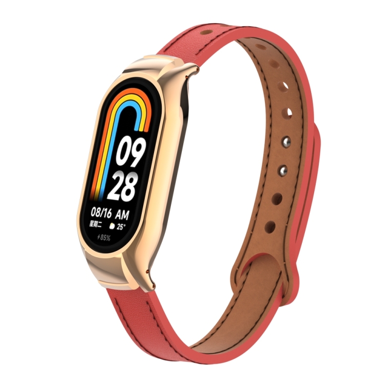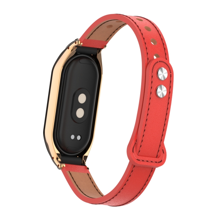 Estuche de Metal Integrado para Xiaomi Mi Band 8 con Banda de Cuero de Microfibra Doble Clavo (Rojo)