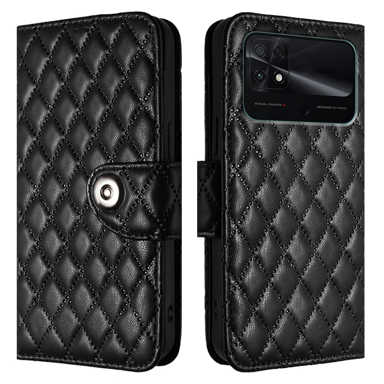 Para Xiaomi Poco C40 Funda para Teléfono de Cuero con Tapa con Textura Rombal y Cordón (Negro)