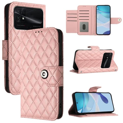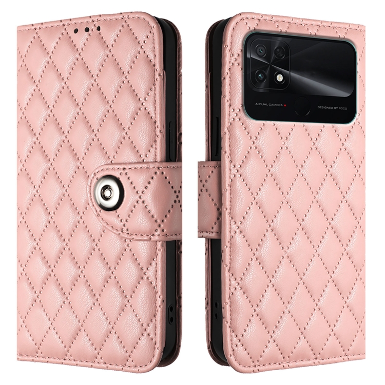 Para Xiaomi Poco C40 Funda para Teléfono de Cuero con Tapa con Textura Rómbica y Cordón (Rosa Coral)