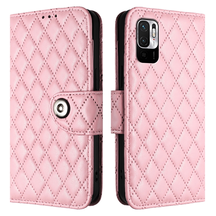 Para Xiaomi Poco M3 Pro Funda de Teléfono con Tapa de Cuero con Textura Rombal y Cordón (Rosa)
