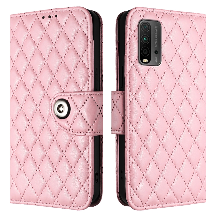 Para Xiaomi Poco M3 / Redmi 9T Funda de Cuero con Tapa con Textura Romboidal y Cordón (Rosa)