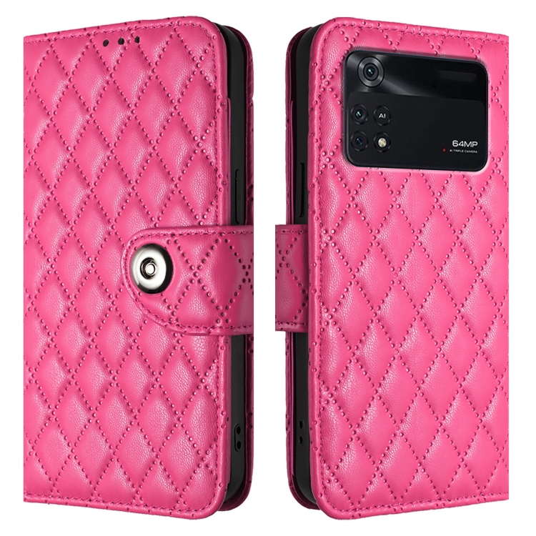 Para Xiaomi Poco M4 Pro 4G Funda para Teléfono con Tapa de Cuero con Textura Romboidal y Cordón (Rojo Rosa)