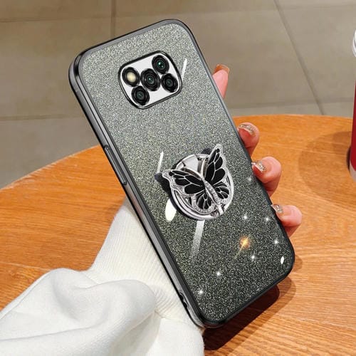 Para Xiaomi Poco X3 Funda para Teléfono TPU con Soporte de Mariposa y Brillo Degradado Plateado (Negro)
