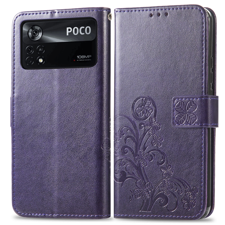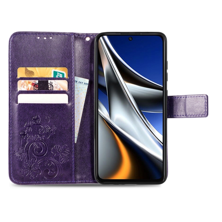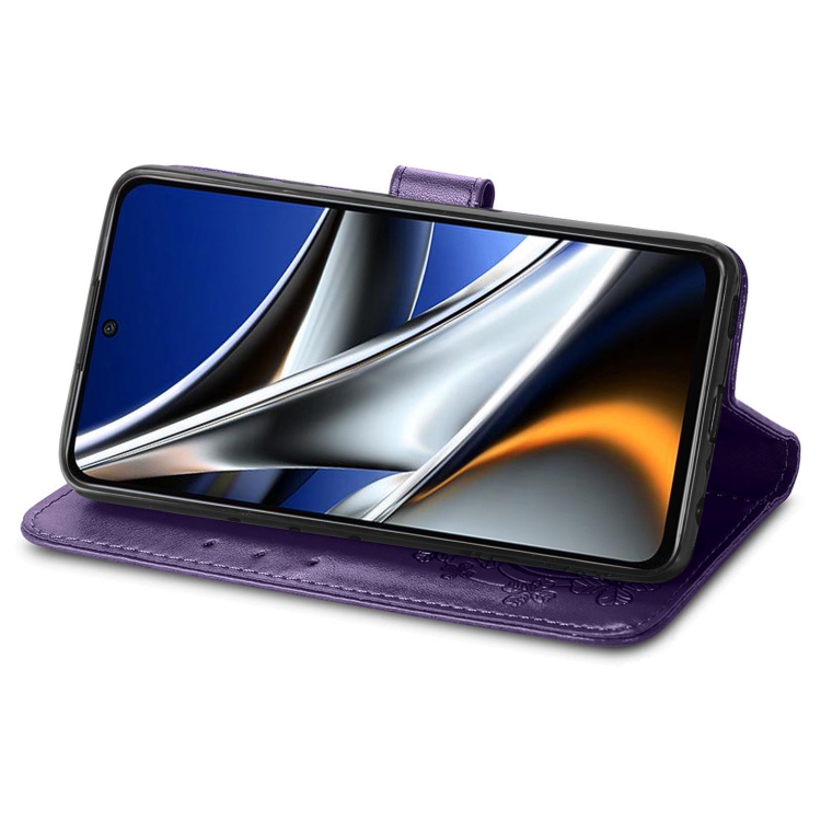 Para Xiaomi Poco X4 Pro 5G Estuche para teléfono de cuero con hebilla en relieve con cierre de cuatro hojas (púrpura)